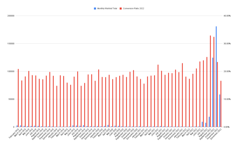 The following chart is for the game Song of Iron, which built up 100K wishlists by launch but unfortunately underperformed. I wrote up my conversation with the developer here.