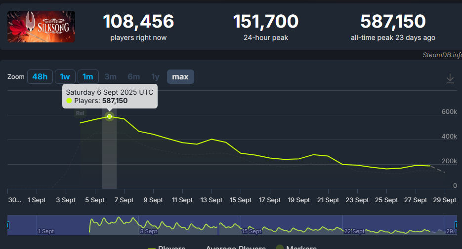 At its peak *ONLY* 587,150 people were playing Silksong.
