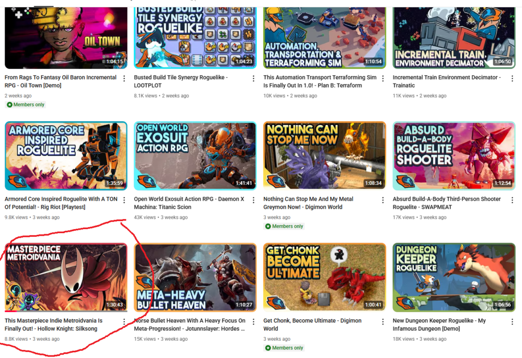 Wanderbots loves Metroidvanias and did a whole series on the first Hollow Knight. But look at his youtube channel during Silksong launch. He only played Silksong one time and it is his second-lowest performing video this month so he moved on and played a bunch of other indie games.