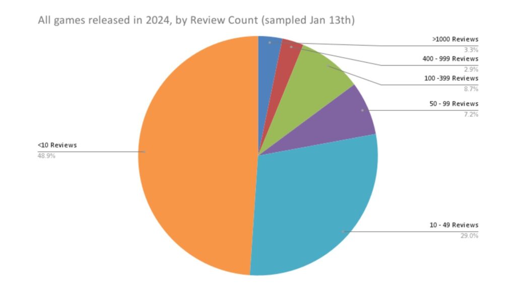 The first thing you have to understand is that over 75% of Steam is bottom of the barrel, low performing. Look at this chart I sampled for 2024’s Steam games. Please internalize this chart. Every year-in-review article that says “OH MY GOD STEAM HAS 18,000 games. THAT’S TOO MANY!” just edit it mentally to see that only 22% are really competitive. Steam’s algorithms hide the rest of these.