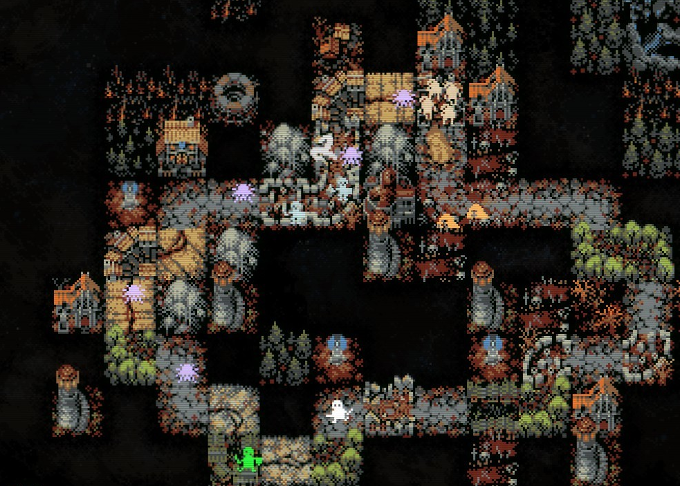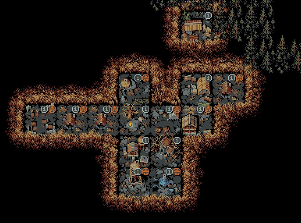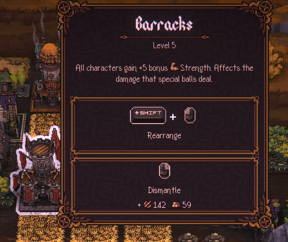 Key innovation adapted from Loop Hero: After every run you spend your loot on building a village that provides additional resources and buildings that unlock unique characters and stat boosts.