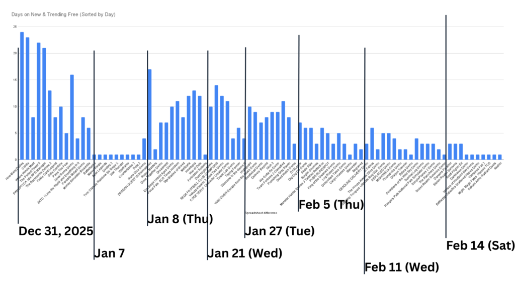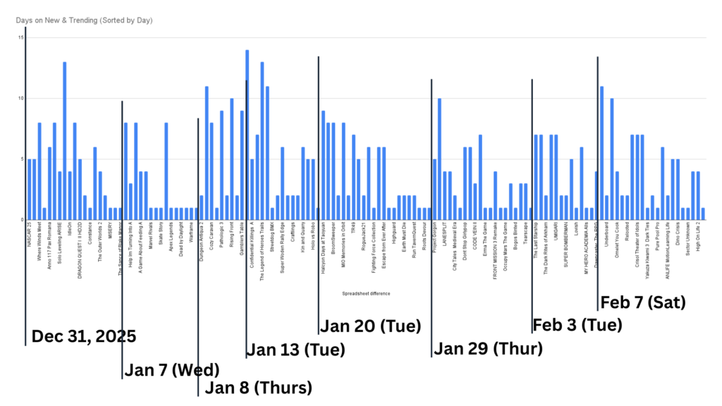 I generated the following chart from the scrape data. It is sorted by day of the week (Dec 31st on the left, Feb 16th on the right). Each blue bar is a different game and its placement is based on when it FIRST appeared on that widget. The higher the bar the more days it spent on that list.