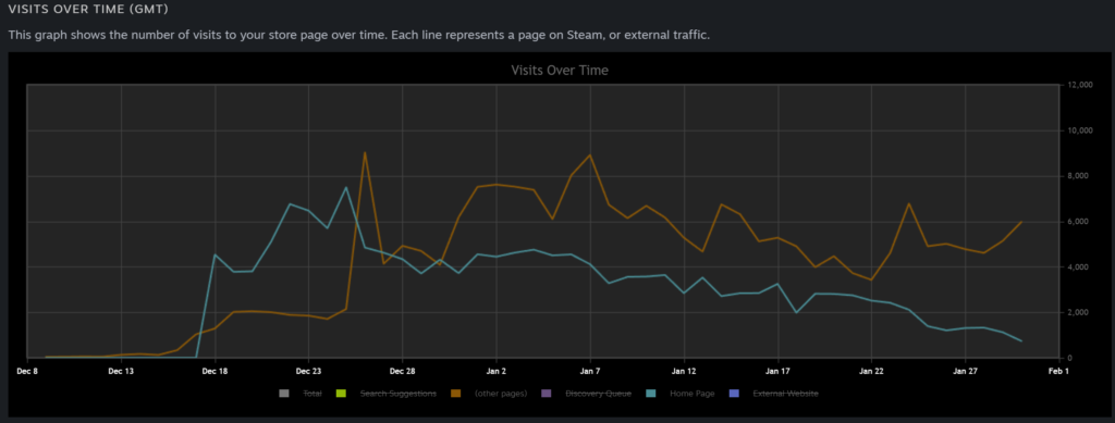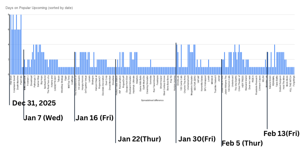 Notice how long the games that were on Popular upcoming during the winter sale stayed there for the full week. Nobody was launching during the new year, so no games were getting pushed off Popular Upcoing (more on this below).