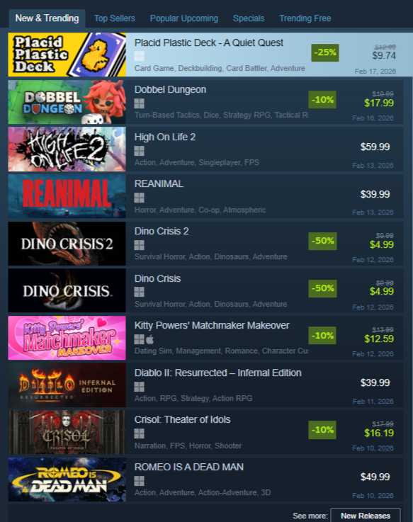 IMPORTANT: NEW&TRENDING IS NOT A RANKED LIST OF WHAT IS SELLING THE BEST. People always make this mistake. They look at the following list and think OH MY GOD “Kitty Powers’ Matchmaker Makeover” is outselling Diablo 2?!? Nope, Kitty Powers just released right after it. It is ordered by release date with the oldest game on the bottom. Look at the dates under the price.