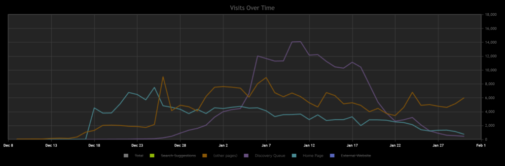 The combination of youtuber coverage and front page featuring triggered the Discovery Queue which REALLY brought in the traffic (the purple line).