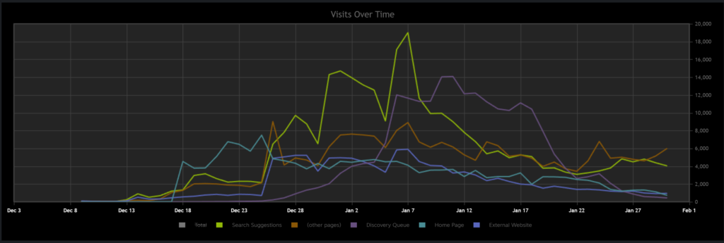 But store page featuring is only one piece. The front page visibility also lead to content creators covering How Many Dudes. Search suggestions (yellow green in chart below) is usually attributed to content creators because people search the games name after watching the video.