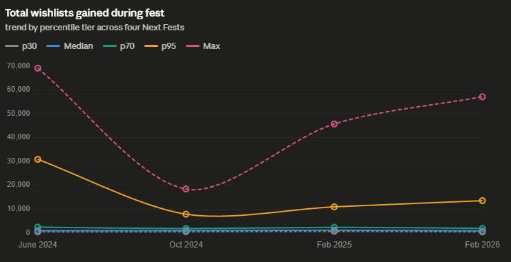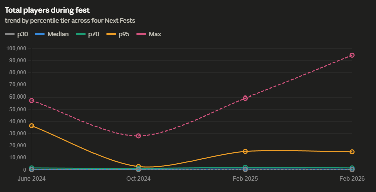 - But the algorithm wasn’t tuned right and nobody got visibility. It hurt the 95p+ games too. This also coincided with the year that 3000 games flooded the October 2024 next Fest. There was a huge dip for everyone. I even wrote about this dip in my summary back then: “Yes, games underperformed compared to previous Next Fests. And, it seems the biggest reduction in visibility was towards top-performing games. Basically, the new algorithm effectively lowered the maximum potential visibility while maintaining the minimum.”