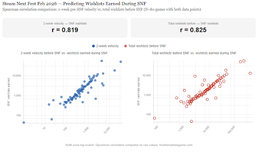 FIRST, if you look at the correlation between wishlists earned in Next Fest, there is still a stronger correlation to having A LOT of wishlists (chart in red) than there is towards velocity (in blue).