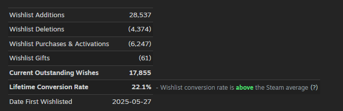 I have seen many games launch with 20K+ wishlists and fail on the launch pad. Not Void Miner. It hit 7000 wishlists and converted at a very respectable 22%.