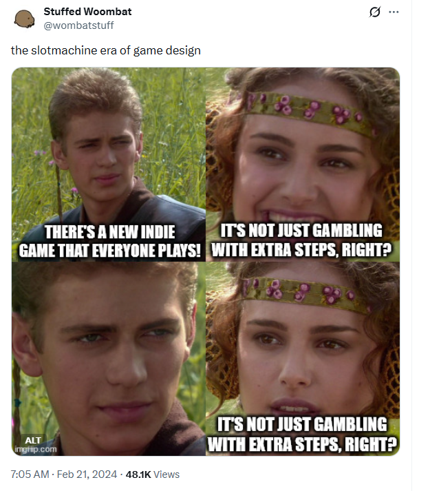 Idle, Horror, Gambling-likes-with-extra-steps, and Friendslop, do so well for developers because the fan base loves to consume them and then move on. Fans consume a BUNCH of them and move on. The games are well defined and are easy to identify at a glance. Are you really going to think hard whether you want to buy that chocolate bar at the check out aisle? No thinking needed. Even if it is a sub-par bar, it is still chocolate and probably going to taste good.